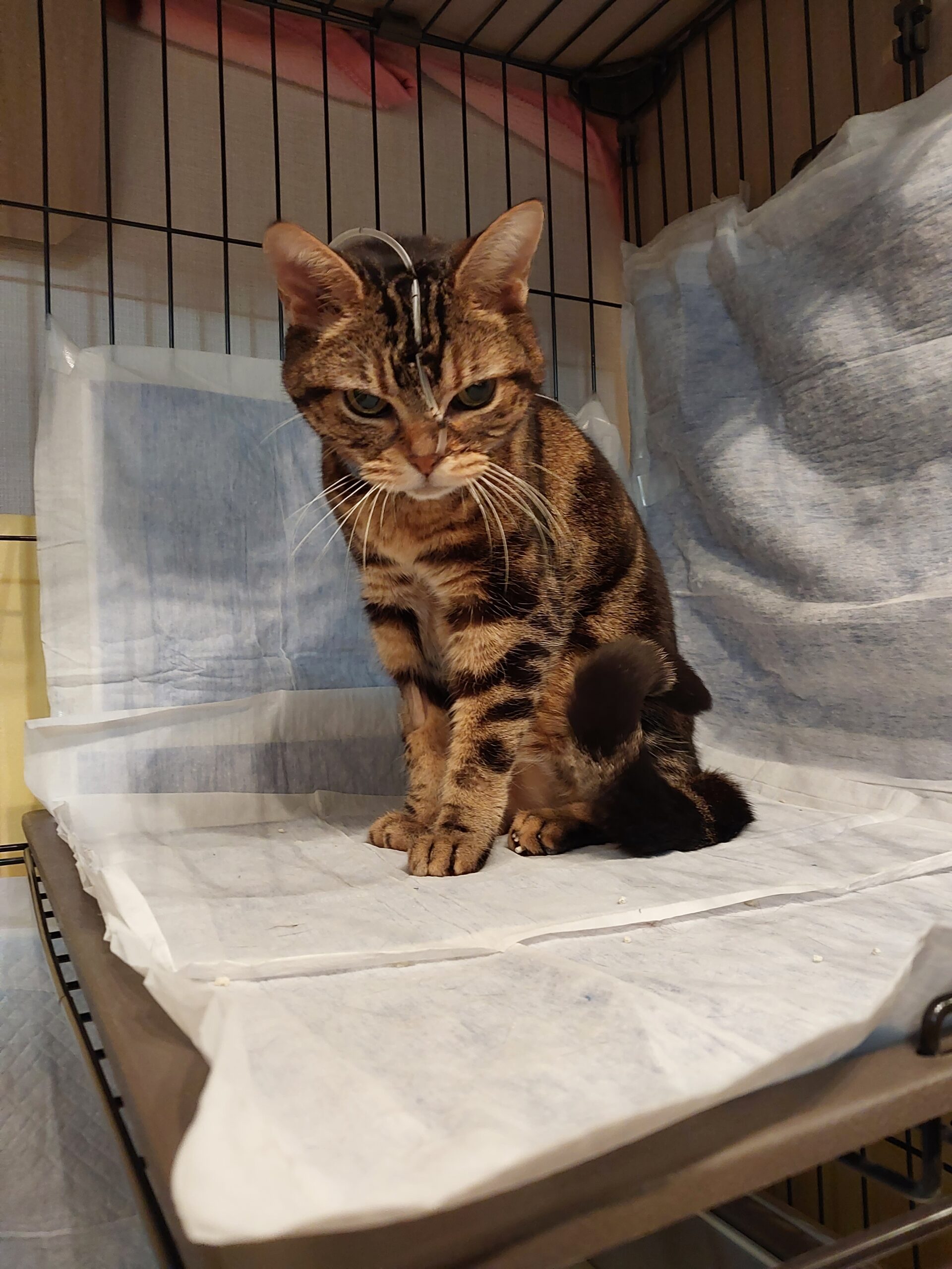 上記のとおり症状はひどいのですが、一方で、この頃からよく鳴き始め、子犬のように「キューン」と頻繁に鳴いてケージから出たがり、そういう時は元気そうにも見え、目もしっかりしていて、しかしいつもの鳴き方ではないので、元気なのか、お腹が痛くて鳴いてるのか、よくわからない状況でした