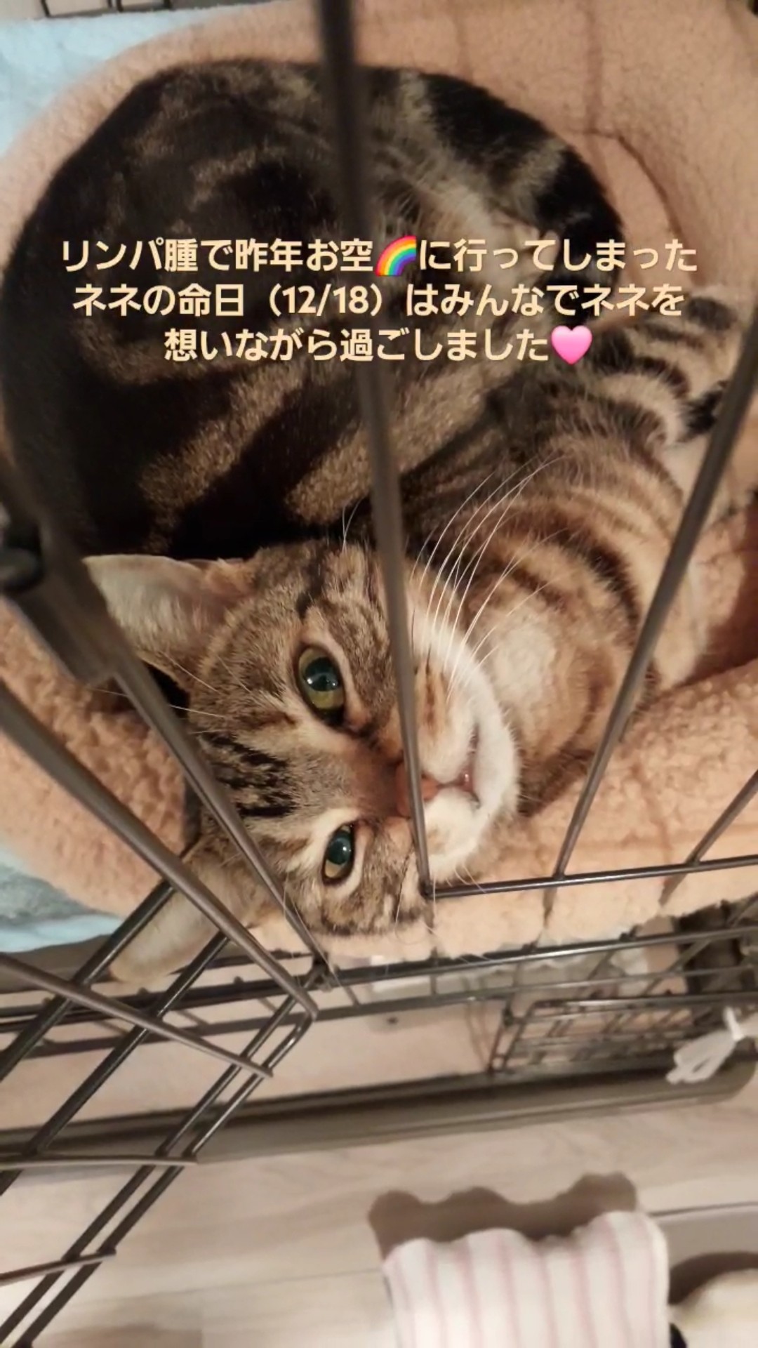 これは個人的な意見であり、科学的な根拠は何もありませんが、感じたことを述べますと、猫にもよると思いますが、猫は話せないだけで、ある程度人間のように分かっていると思うのです。猫にもよると申し上げましたが、トモときなこはそうでもないのですが、ネネは飼い主にも他の猫たちにもとても愛情深くて、行動に頻繁に現れていました。一例を申し上げますと、私の言うことを聞かないで暴れているきなこに、自らはリンパ腫で辛い状態なのに、立ち上がってきなこを叱りに行く行動には涙が出ましたが、それ他にも不思議なことがあったのですが、ネネが亡くなった病気が十二指腸のリンパ腫でしたが、この時期に私が健康診断で十二指腸の腫瘍が見つかり検査の結果良性ということでしたが、同じ時期、同じ部位に私とネネに腫瘍ができたので、もしかしたらネネが身代わりで持っていってくれたのではないかと思わずにはいられないのです。