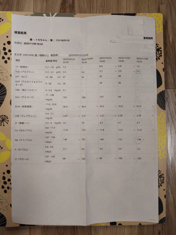 その後も、                  「補水については更にシリンジによる飲水を嫌がるようになり、味の付いたものなら飲むと思い、ハイドラケア1袋に12mlのシリンジでお水を11本(130ml程度)入れて希釈したものを1日1回と、夜に12mlのシリンジ8本(100ml弱)の合計230ml程度しかお水が飲めていなかった」                      ので、トモの腎不全の腎臓にお水は足りているか、脱水になっていないかについて、2025年10月25日も血圧測定と血液検査をしていただきましたが、前回同様、最高血圧も血液検査結果も病状の悪化と言える程の結果ではありませんでした。