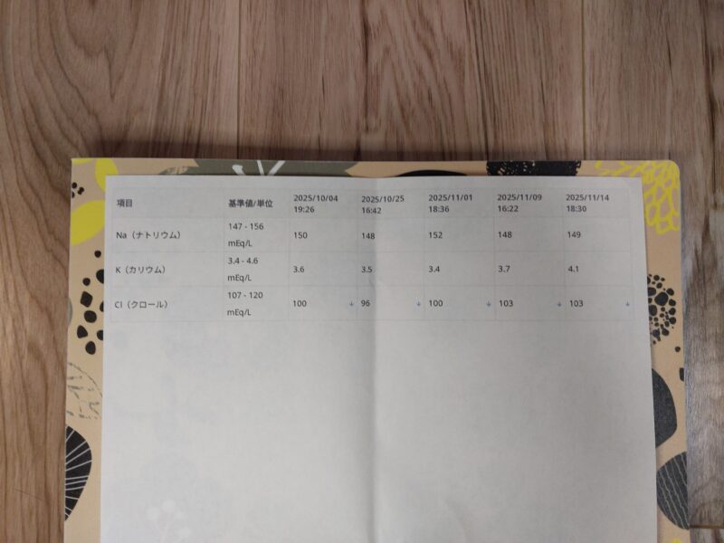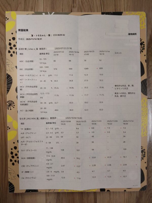 その後も、 「補水については更にシリンジによる飲水を嫌がるようになり、味の付いたものなら飲むと思い、ハイドラケア1袋に12mlのシリンジでお水を11本(130ml程度)入れて希釈したものを1日1回と、夜に12mlのシリンジ8本(100ml弱)の合計230ml程度しかお水が飲めていなかった」 ので、トモの腎不全の腎臓にお水は足りているか、脱水になっていないかについて、2025年10月25日も血圧測定と血液検査をしていただきましたが、前回同様、最高血圧も血液検査結果も病状の悪化と言える程の結果ではありませんでした。