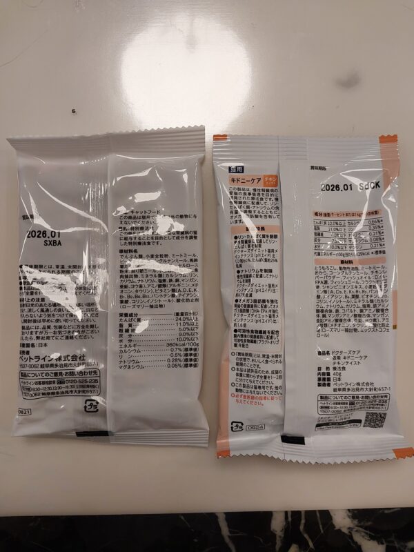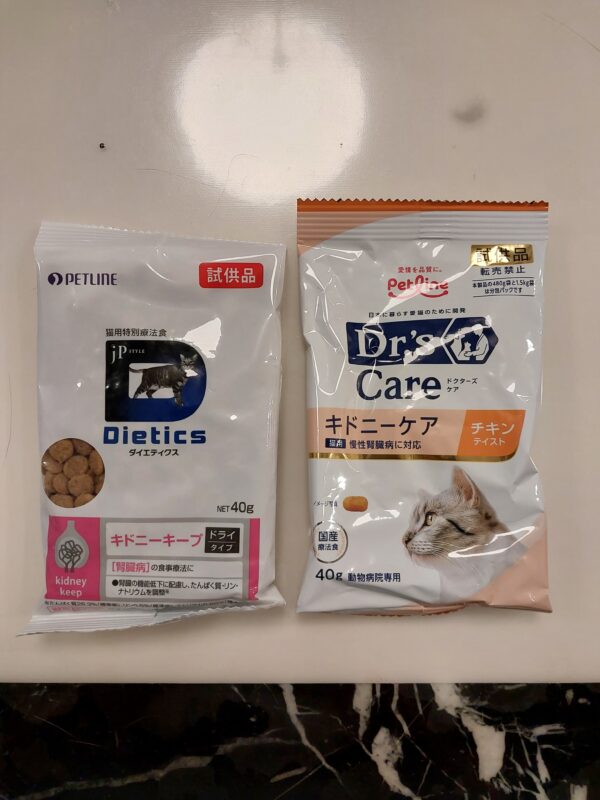 →耳に湿布するタイプの食欲増強剤を塗ってもらい、腎臓サポートの試供品2種類をいただいた。先生からは、「ご飯は少しでも食べていたら良い、2日間ご飯食べない、ぐったりして明らかにおかしい、呼吸(吸って吐いてを1回として)1分40回超える等があればすぐに連れて来てください。」とのご指示がありました。