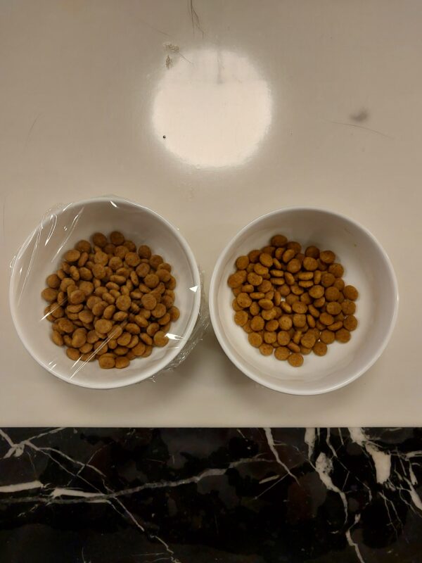 本日院長先生にお伝えした症状について、以下の処置とご説明がありました。 ①空中見てずっと口をクチャクチャしているはなくなった、正気に戻った感じ。 →昨日のインターキャットで元気になっているなら数日インターキャットで菌を減らして治療する方法があるので今日もインターキャット注射する。 ②お水はハイドラケアを130mlのお水で希釈したものを自力で飲めるが、ご飯がほぼ食べられないという状態(以下の画像のラップをしている左の餌が1日のロイヤルカナン腎臓サポートの量、右はトモが1日で食べ残した量、ほとんど食べられていない)。