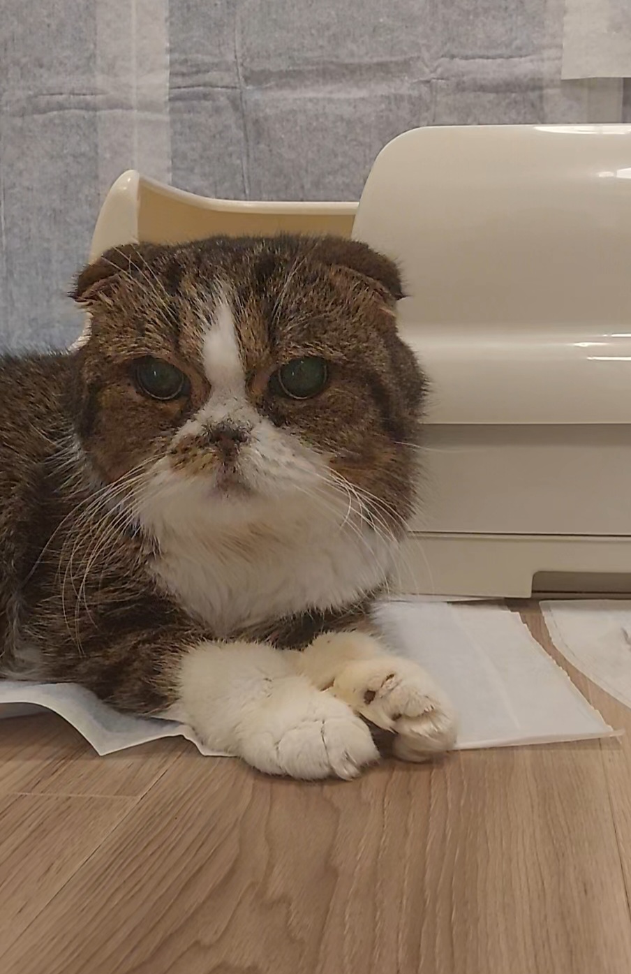 その後は、トモを介護している時に、 ①お世話のためにトモを抱えたら胸のあたりで電気刺激又は痙攣あり。心臓の壁が厚いと言われていたが、悪化していないか? ②撫でていただけで初めて失禁、口呼吸している時がある。 ③水や薬をあげると胃からゴロゴロ音がするので、胃が悪くなっているのではないか。胃の調子が悪くなったためか、シリンジの水が日によって飲めない時が多くなり、飲む量が安定性しない。毎回補水時にオシッコ又はウンチを漏らす。吐き気で上がってきたものをクチャクチャ言って飲み込んでいるようだ。歯磨き粉で歯磨きしてるだけでも口をぱくぱくして飲み込んでいた。 ④トイレでよく座っているようになった。10分以上でてこない。残尿感か? ⑤食欲は低下したが一日の量は時間をかければ食べられる。 ⑥認知機能がおちてきている気がする。 というようなことがあり心配でしたので、2025年11月1日に動物病院に行って相談してきましたが、Echo検査の結果心臓や肺に水は溜まっておらず、最高血圧は10月25日と同じく169mmHg、クレアチニン2.28mg/dlと悪化なし、尿素窒素55.8mg/dlと50台ですが急激な悪化なし、無機リン、カルシウムの数値も悪化していませんでしたが、レントゲン撮影をしたところ、お腹に空気がたくさん溜まっており、鼻が詰まっていて口から飲んだ空気でお腹がパンパンになっているので、これがお水が飲めない原因ではないかということで、猫風邪など猫ウイルス性鼻気管炎に効果があるインターキャット注射とネブライザー(吸入)をしてもらい、数日の様子をよく観察してきました。