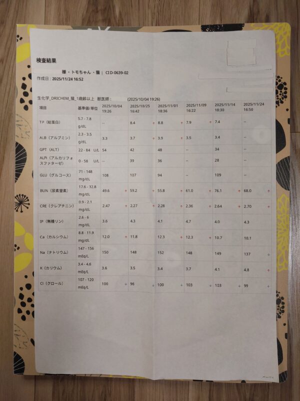 CRE(クレアチニン)の数値は、2024年は、 1月6日2.35mg/dl、1月20日2.26mg/dl、 2月3日2.42mg/dl、2月20日2.47mg/dl、 3月2日2.25mg/dl、3月23日2.36mg/dl、 4月6日2.45mg/dl、4月20日2.51mg/dl、 5月4日2.46mg/dl、5月18日2.59mg/dl、 6月1日2.51mg/dl、6月15日2.57mg/dl、 6月29日2.74mg/dl、7月13日2.39mg/dl、 7月29日2.34mg/dl、8月10日2.45mg/dl、 9月7日2.81mg/dl、9月21日2.55mg/dl、 10月5日2.36mg/dl、10月19日2.49mg/dl、 11月2日2.54mg/dl、11月16日2.43mg/dl、 12月28日2.64mg/dl でしたが、今年(2025年)の数値は、 2月1日2.43mg/dl、2月15日2.24mg/dl、 3月8日2.8mg/dl、3月29日2.38mg/dl、 4月26日2.25mg/dl、7月12日2.58mg/dl、 7月22日2.67mg/dl、10月4日2.47mg/dl、 10月25日2.27mg/dl、11月1日2.28mg/dl、 11月9日2.36mg/dl、11月14日2.64mg/dl、 11月24日2.70mg/dl という数値で、心臓に溜まったお水を抜くことを優先するため、トモのシリンジによる経口補水を止めて、自力の飲水のみにしていたことで、お水が足りなくなっているせいか、徐々にクレアチニンの数値が上がってきています。しかし、基準値(基準値は0.90〜2.10)は少し超えている範囲に今のところは収まっており、急激な腎臓の悪化はありませんでした。