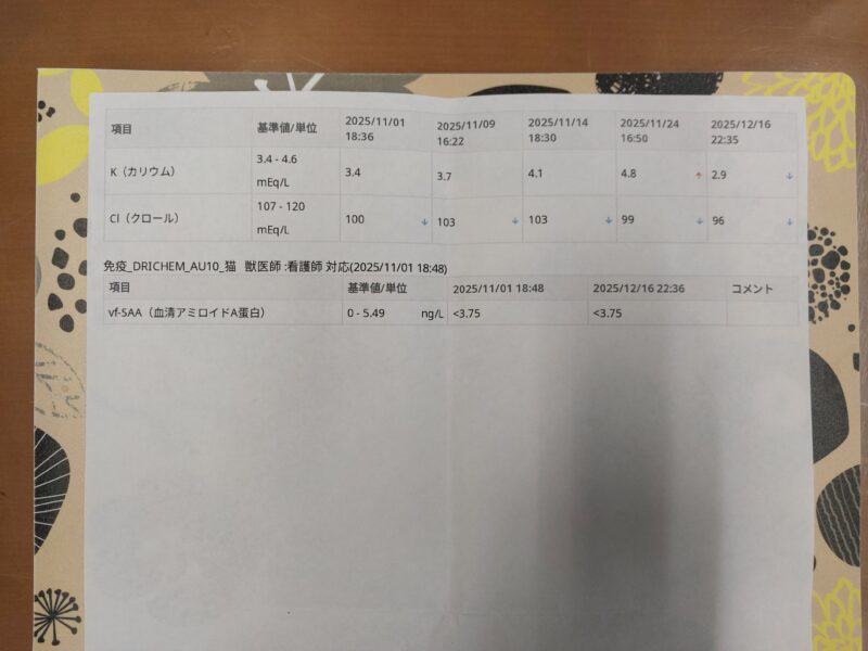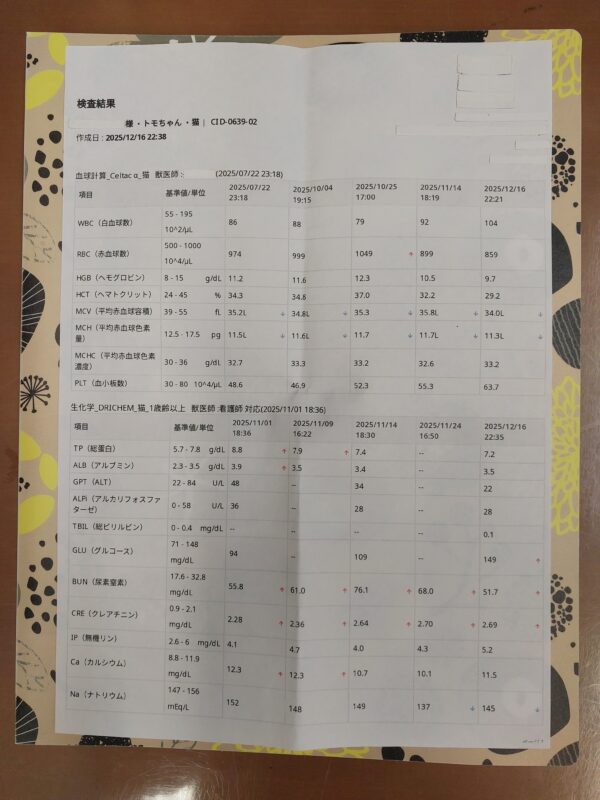 CRE(クレアチニン)の数値は、2024年は、                   1月6日2.35mg/dl、1月20日2.26mg/dl、       2月3日2.42mg/dl、2月20日2.47mg/dl、       3月2日2.25mg/dl、3月23日2.36mg/dl、       4月6日2.45mg/dl、4月20日2.51mg/dl、       5月4日2.46mg/dl、5月18日2.59mg/dl、       6月1日2.51mg/dl、6月15日2.57mg/dl、       6月29日2.74mg/dl、7月13日2.39mg/dl、      7月29日2.34mg/dl、8月10日2.45mg/dl、      9月7日2.81mg/dl、9月21日2.55mg/dl、      10月5日2.36mg/dl、10月19日2.49mg/dl、     11月2日2.54mg/dl、11月16日2.43mg/dl、     12月28日2.64mg/dl                でしたが、今年(2025年)の数値は、          2月1日2.43mg/dl、2月15日2.24mg/dl、       3月8日2.8mg/dl、3月29日2.38mg/dl、        4月26日2.25mg/dl、7月12日2.58mg/dl、       7月22日2.67mg/dl、10月4日2.47mg/dl、     10月25日2.27mg/dl、11月1日2.28mg/dl、     11月9日2.36mg/dl、11月14日2.64mg/dl、     11月24日2.70mg/dl、12月16日2.69mg/dl                で、心臓のケアを優先するため本人(トモ)任せの経口補水にしていますが、ご飯が食べれていないせいか、基準値(基準値は0.90〜2.10)は少し超えている範囲に今のところは収まっており、急激な腎臓の悪化はありませんでした。